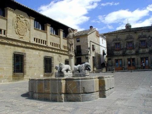 Para iniciar este intenso recorrido por sus calles nos situamos en la Plaza del Pópulo, presidida en el centro por la Fuente de los Leones, monumento ibero-romano; en la parte alta de la plaza se erige la Casa del Pópulo, bello edificio plateresco, hoy sede de la oficina de turismo; en un lateral está la Antigua CarnicerÃa, edificio del siglo XVI, utilizado como matadero, que fue trasladado a esta plaza piedra a piedra; a unos metros se encuentra el Arco de Villalar, del siglo XVI, formando un conjunto con la Puerta de Jaén, vestigio del antiguo recinto amurallado.
