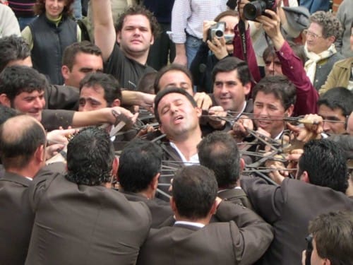 Del mismo modo, la romerÃa sigue su curso entre panderetas, guitarras y bandurrias, con un acto final, denominado el degüello o patatú, en el que los danzantes, con sus espadas, simulan la degollación del maestro, mientras turistas y lugareños miran expectantes la escena.